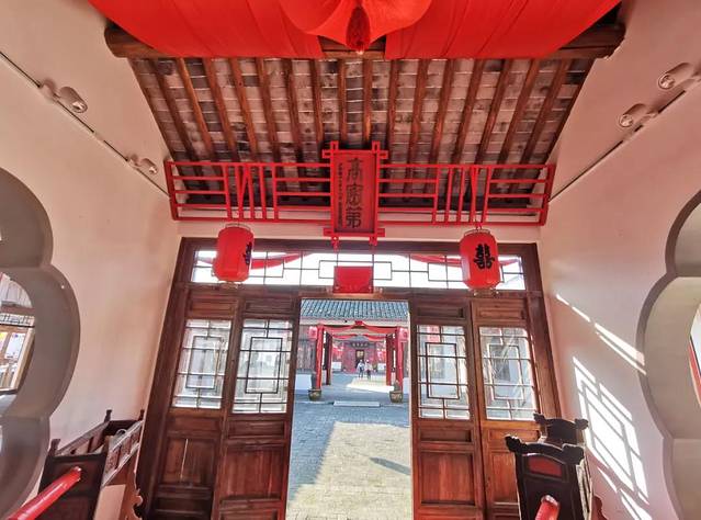 走进喜园,层层叠叠的仿古建筑,形成了三个四合院落,分别设为“红妆喜事”展区、“与子同梦”展区和“百子乐园”展区,展区内皆采取“矩阵式”布展,沉浸式情景演绎,紧扣主题,循序渐进地展示中国喜文化的魅力。