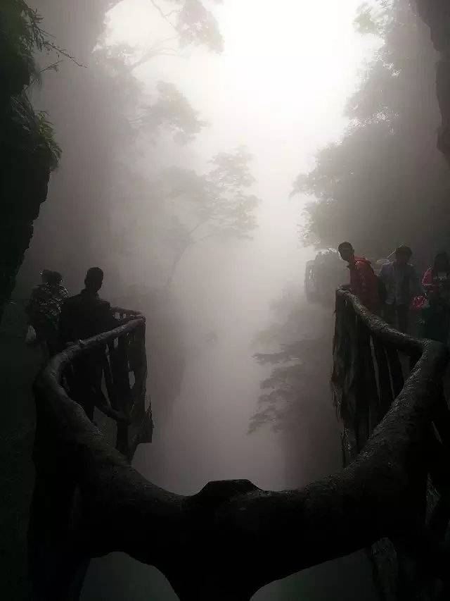 下山看到很多这样的U型谷,中间就是万丈深渊,往下看像是要把人吞噬的幽深,茂密的树林将土壤遮盖得严丝合缝深藏不露,只是一片绿不见一点异样的颜色,拍这张图片的时候雾尚未完全散去,所以恐高的人应该也不是很害怕,因为看不到深渊就可以忽略它的现实存在,哈哈。