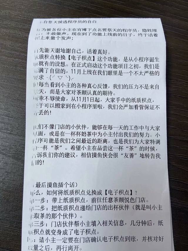 关注过察颜悦色的官方微博,不知道是不是换了博主,感觉现在没有以前那么幽默了。现在也可以在茶颜的官方旗舰店买到周边,方便许多,我们去的时候是在店里扫码关注微信公众号充了200会员卡,出生日期店员让我们设置在第二天,这样生日当天就可以免费喝到一杯茶颜,均价15块的茶颜悦色一直只在长沙本土开业,近期才在长沙周边城市开枝散叶,博主曾辟谣说茶颜开到省外某某城市去的回答是:茶颜现在还没有那么多钱可以开分店开到省外去!哈哈。