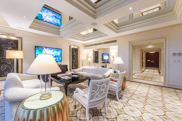 套房里面还有一个客厅,在客厅里可以跟朋友们聚会聊天,也能在这里上网办公。这个客厅的设置就是非常科学的符合了中国人的需求,所以澳门永利皇宫酒店的设计不仅是奢华的、科学的,还是人性化的。