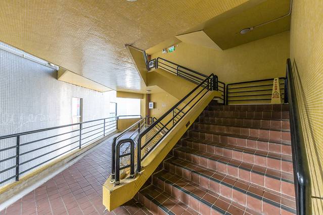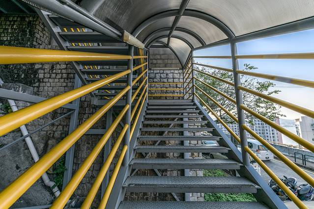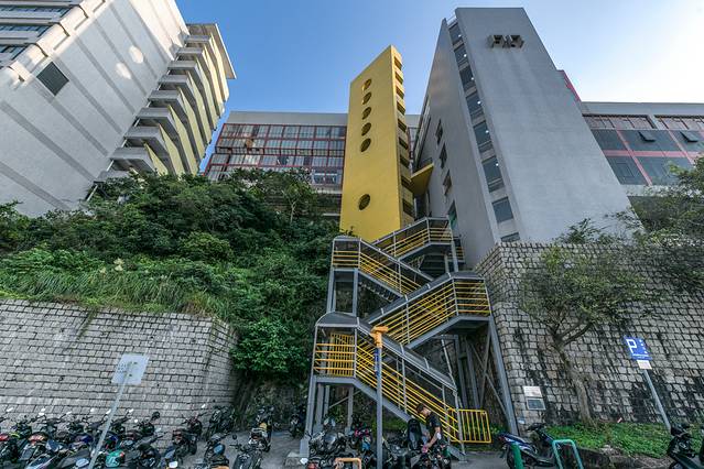澳门城市大学是环绕小潭山层层叠加而其的高校,每栋大厦、地上层都配有人行楼梯和电动扶梯,众多的楼梯与电梯成为楼层之间频繁联系的通道。