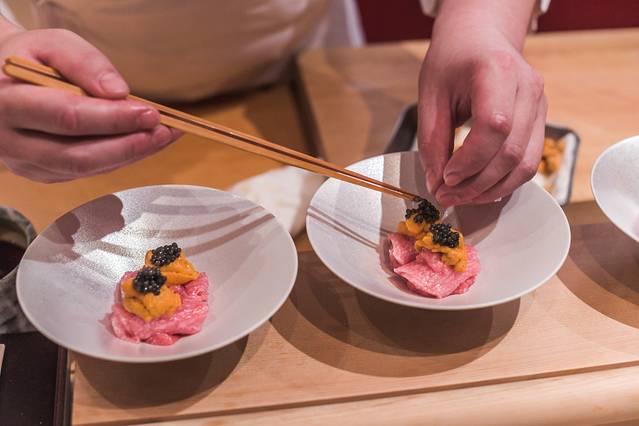 澳门泓日本料理餐厅最招牌的菜品有特级寿司拼盘、海胆炒蛋、日本和牛铁板烧以及蕨饼配豆粉。