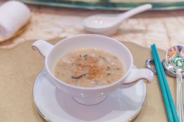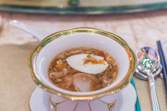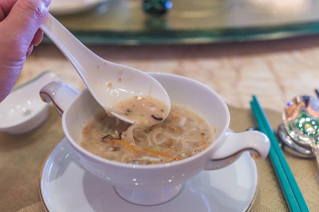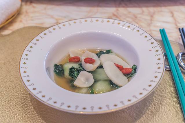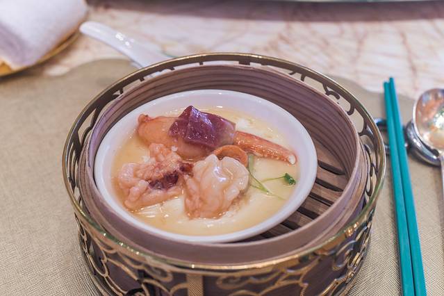 这道很开胃的菜是永利宫餐厅的资深主厨研发的菜品,是以大陆的酸辣汤为基础结合澳门实际情况与饮食结构研发了一款开胃菜,味道很好,很值得推荐尝一尝。