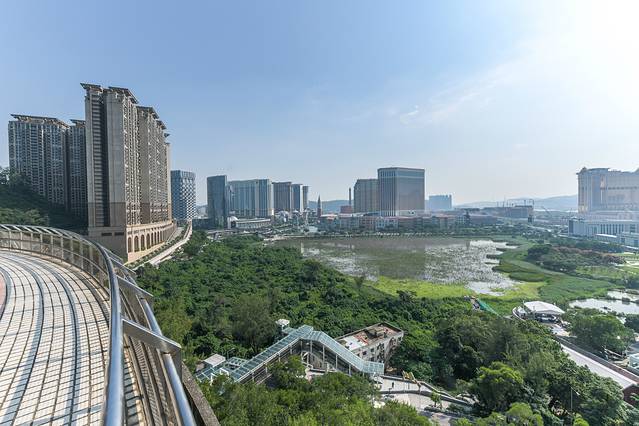 看到这个视角后估计很多人都会疑问这是在哪里,此处就是我要说的大潭山。大潭山是澳门氹仔视角开阔的地方,海拔超过了150米,最高顶峰接近160米了。在大潭山即可鸟瞰到整个氹仔新城,威尼斯人、金沙城、新濠天地等度假中心一览无余的被纳入眼睛里。