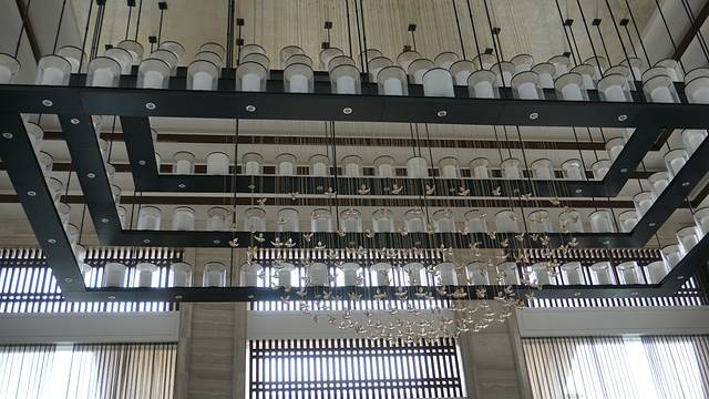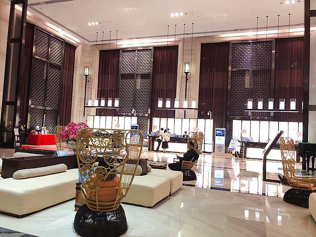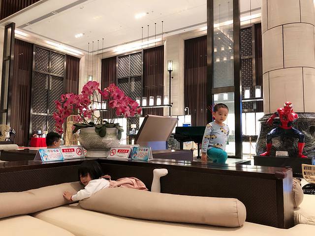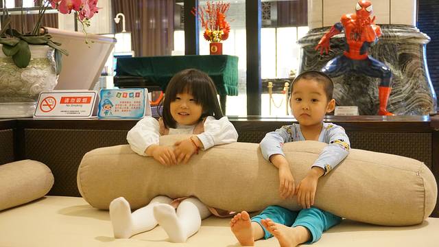 这两个小朋友一在酒店大堂见面后,仿佛这个世界就是他们俩的,完全没有我们几个大人的事情了。为了让他们尽情的玩,闺蜜Kami说她去办理入住,让我们看着小孩就行。这酒店大堂确实挺不错的,无论是天花板,还是一桌一椅,所有的摆设都非常用心。