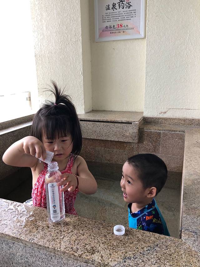 可是这两小家伙哪里是泡温泉啊,居然是拿着矿泉水瓶和可乐罐在玩装水比赛,看谁先装满。好吧,小孩子的世界快乐就是如此简单~