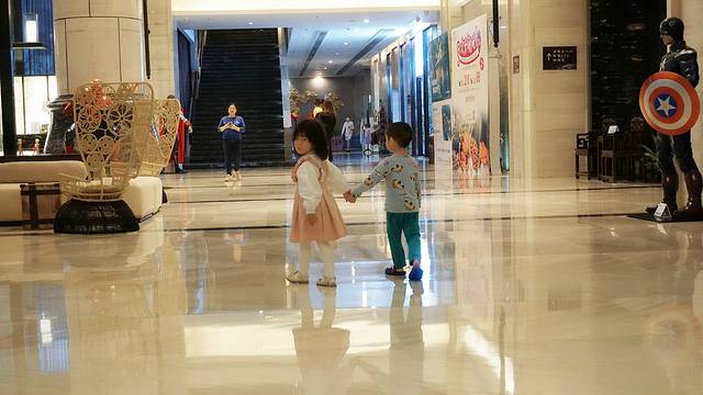 两个小朋友也喜欢得不行。手拉着手一起在大堂到处走,一会跑到沙发上搬运抱枕,一会在沙发上玩捉迷藏。