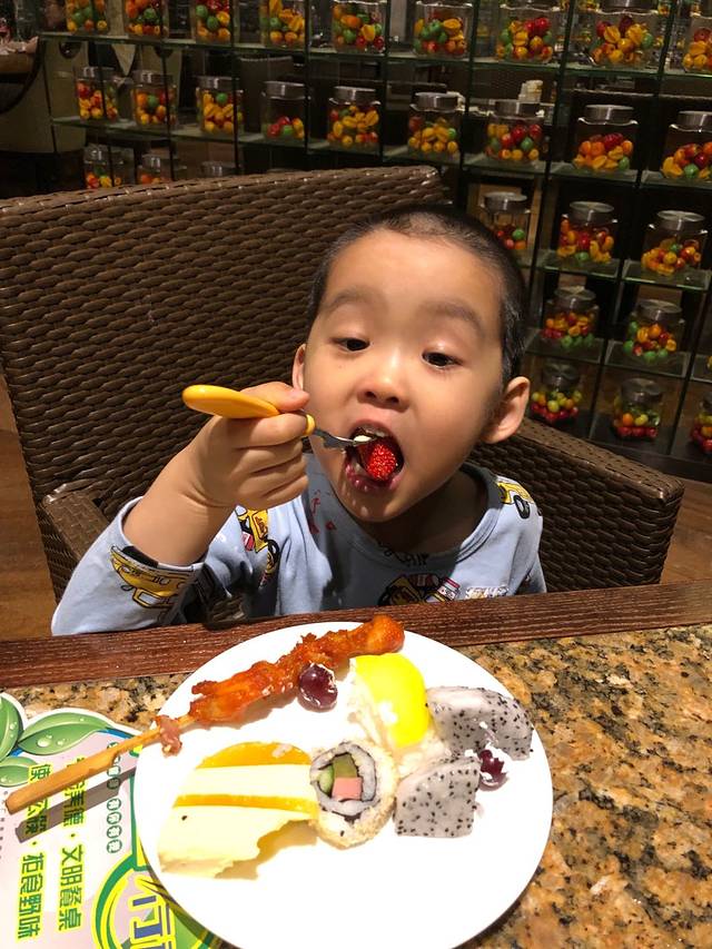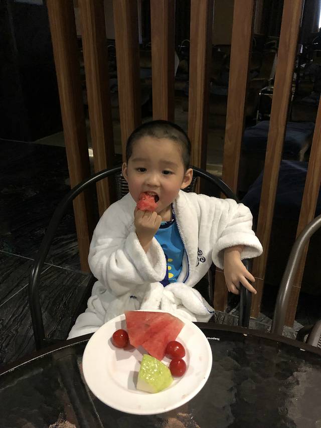 玩了一下午,玩得也够累了,兜兜妹妹早早就跟闺蜜Kami回房休息了,而我们却在温泉休息区逗留了一会。因为这里可以领取儿子喜欢吃的水果,有西瓜、小番茄和番石榴,所以儿子并不急着回房间。而ken哥和我则在一旁喝着罗汉果茶和红枣杞子茶,一边帮着儿子拍照,感受一家人的幸福时光。