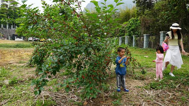 原来儿子发现了前面有棵桑葚树,问我们这些果子能不能吃。我们就为他和兜兜妹妹做起科普来,说这是桑葚树,桑果全黑的是熟透的,半红半黑的还要再等等,全红的还没有熟,吃起来是酸的。桑果非常有营养,不仅可以抗氧化,降血糖,还可以抗衰老呢。一说到有抗衰作用,我默默的摘多了几颗放在嘴里,哈哈哈~