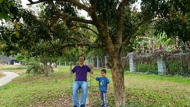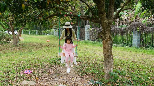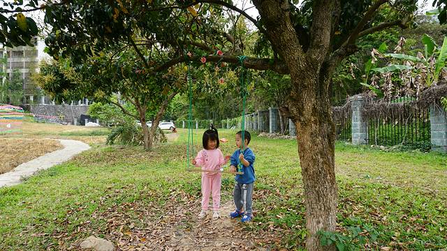 在彩虹风车拍了一会照,兜兜妹妹发现前面的树上有秋千,拉着我儿子Jerry一起往前跑去,我们几个大人也只能马上跟着。在我们的帮忙下,两个小朋友轮流玩起了秋千,笑得特别开心。