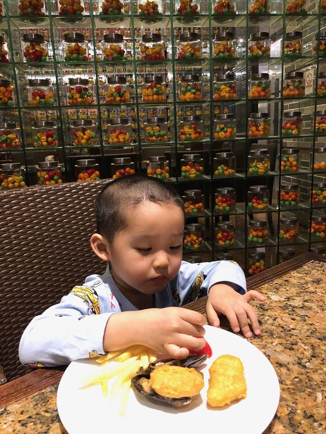 等我们拿完一轮食物,坐在一起后,发现桌子上除了有虾、青口、鱼生等食物,居然看到还有薯条、番茄酱和炸鸡块,不用问,这些肯定是儿子偷偷叫Ken哥帮忙拿的最爱了,去哪里都喜欢吃这些。