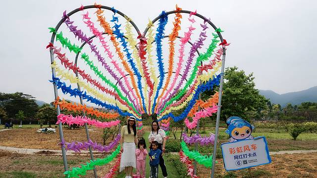 第一站我们来到了酒店门口不远处的彩虹风车,在微风的吹动下,彩虹风车慢慢的转动,那种画面和动感实在太好看了,两个小朋友也吵着要拍照留念。