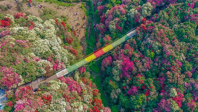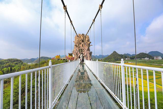 彝山花谷内的玻璃吊桥又称彩虹廊桥,全长120米,站在桥上不仅能体验到吊桥本身的惊险刺激,还能将整个花谷的景色尽收眼底,既可眺望远处的群山,又可聆听脚下的溪山流水。