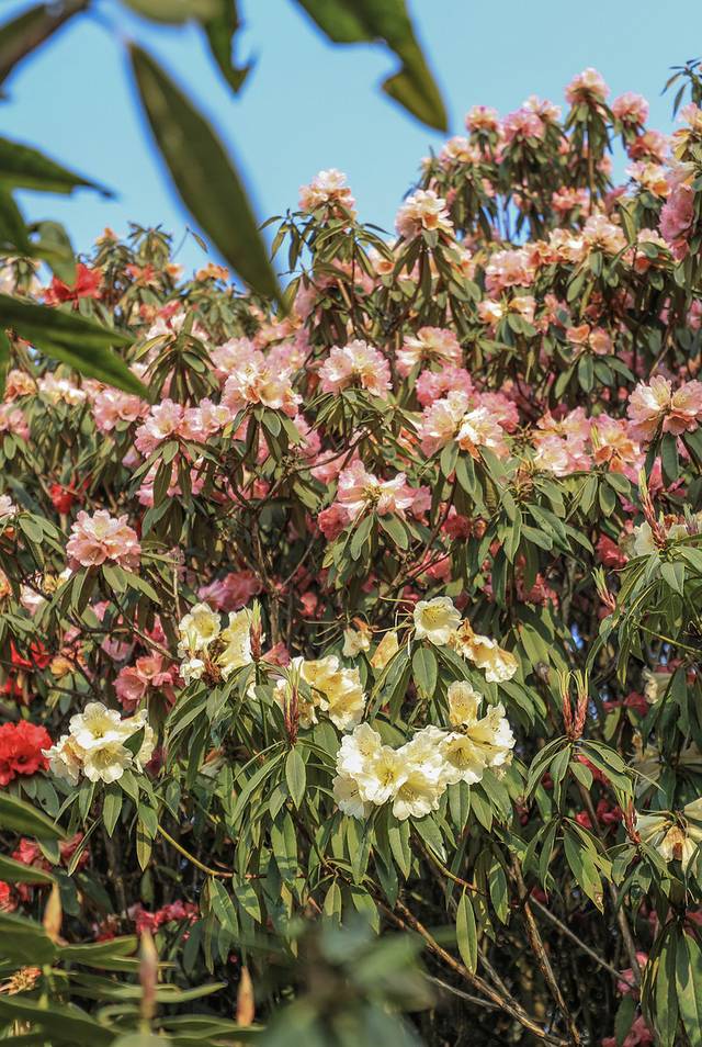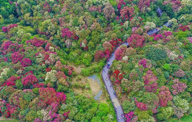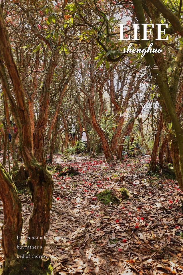 沿着杜鹃花梯,一路走到五彩路,满地的落花,也是别有一番韵味!在往深处走去,沿伸在小路间高高低低,密密麻麻的杜鹃花不断扑面而来、拂面而去,大的数十根树干簇生一蔸,小的独树一株,舒影横斜。高的一仗有余,虬枝舒展;低的不过盈尺,小巧玲珑。