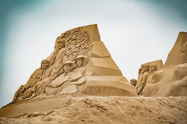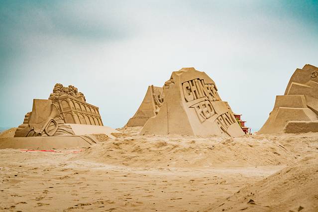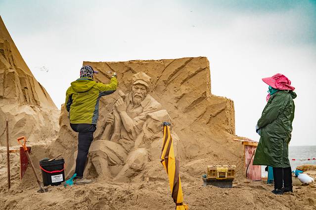 沙雕作品具有较强的故事性和趣味性,是自然美与艺术美的和谐统一 ,具有强烈的视觉冲击力。万丈高楼平地起,坚实的基础对于沙雕制作而言,尤为重要。即便是建模部分,就需要工人和机械来协同操作。