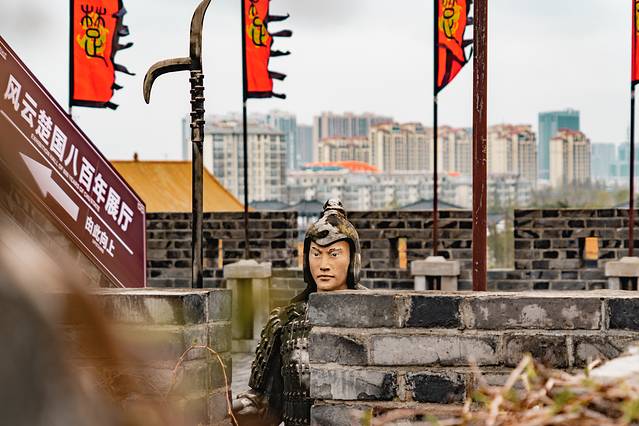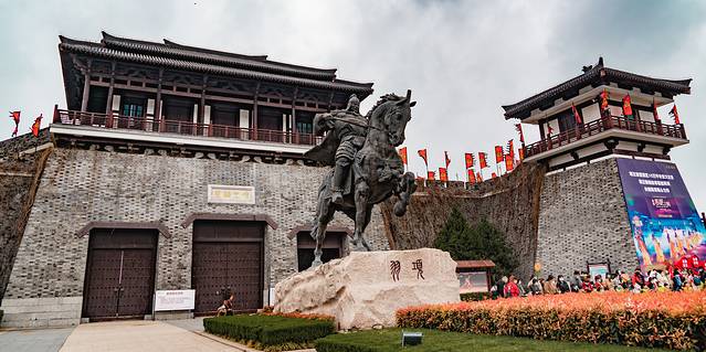 在项王故里的广场上,远远地就能看到9.9米高的项王铜像,以雄迈今古、提兵跃马的姿态立于城墙前方。