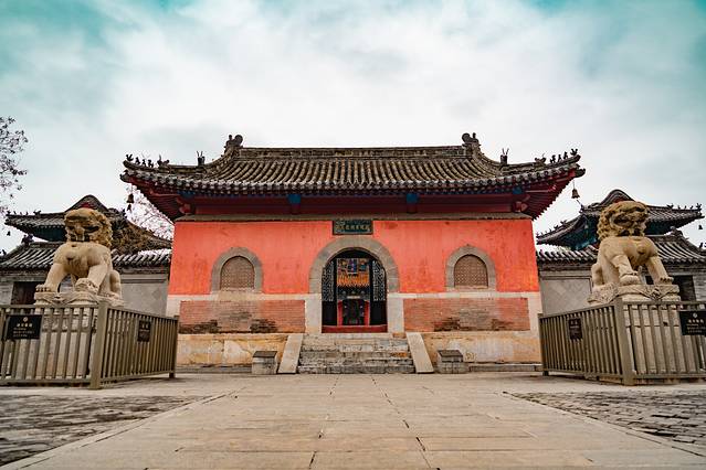第二进院落是整体建筑的中心,主体建筑是“龙王殿”又称“绿瓦殿”,两侧对应有东、西配殿。龙王殿雕梁画栋,斗拱飞檐,结构严谨,金碧辉煌,乾隆皇帝5次下榻龙王庙,也是在这里朝政议事、敬神祭祖的。