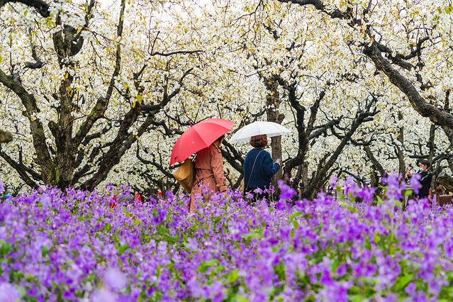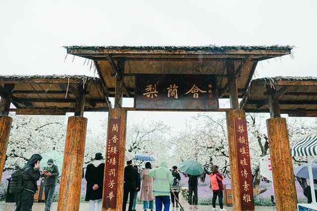 走过雾森栈道,沿指示牌前行就抵达梨兰会了,在到达梨兰会现场前,会经过“春的集市”,走得累了、饿了,可以在这里填饱肚了,这里也有漂亮的伞啊、扇啊之类的拍照辅助道具,可以给你拍照增色不少。