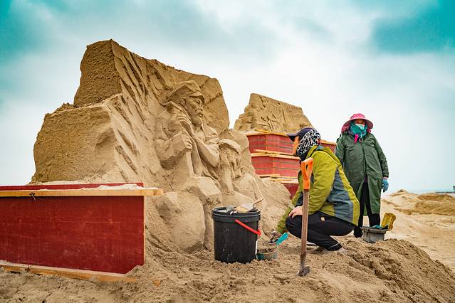 在沙滩的东北角,有沙雕工人在整张的忙碌着,他们是在为2021年第三届中国宿迁骆马湖国际沙雕节做前期准备工作。据悉,本届沙雕节以“百年征程,流光溢彩”为主题,旨在弘扬民族精神和爱国情怀。
