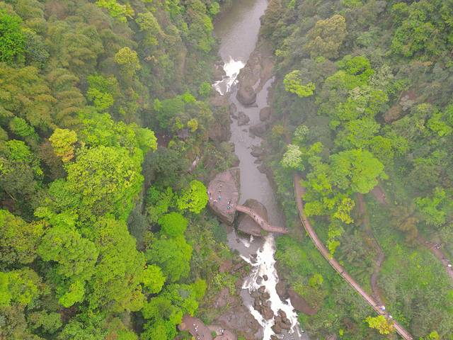 整个景区单边4.5公里,徒步全程大概4-5小时,都是在爬山,加上游览需要大半天时间,体力不好的可以考虑观光车。观光车把我们送到山顶,这个时候就需要坐电梯了,大瀑布在下面,可以徒步下去,也可以坐电梯下去,徒步大概20分钟左右。
