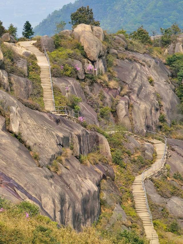 能登上顶峰,看到的景色自然不同。尤其我们登山的时间安排在下午,最终爬到山顶后,还有幸看到了大罗山的落日晚霞。绿色的青山在艳丽的杜鹃花的点缀下,在色温极高的晚霞中,大罗山像蒙了一层神秘的面纱,展现出与白天完全迥异的景致。
