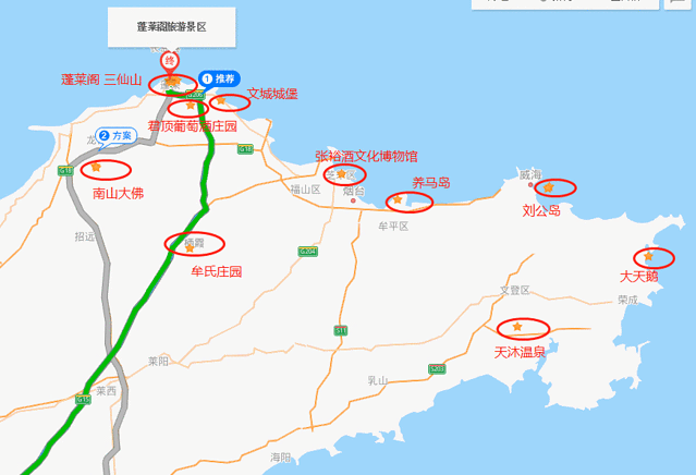 自己提前攻略圈出可游玩的景点,依据景点精华、行驶距离时间而定。最后,筛选出四个景点:蓬莱阁,三仙山,君顶葡萄酒庄园,牟氏庄园。自驾游蓬莱二日纯粹是为了老妈第一次来,我们三人多年之前都有来玩过,一是打发无聊的三天长假,二是相对于蓬莱的景致还是值得游玩。