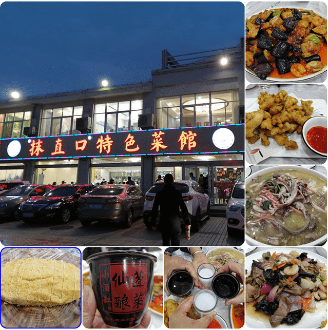 等了好久上了一盘菜,菜量是真不小,因午餐吃的太饭馆,晚餐只点了四个菜,没想到都是大盘量,还点上了一个特色的玉米大饼子,菜的口味很纯正,龙利鱼炸的鲜嫩,沾上番茄酱别有一番滋味,很适合老人孩子吃。记不得菜名了,猪肚丝做的汤菜,虾仁扇贝肉烧茄子很有特点,味道鲜美。给老爸买上了一瓶蓬莱仙酿,老妈看着四大盘菜,一直劝菜不能浪费,吃到酒足饭饱,打车回酒店。