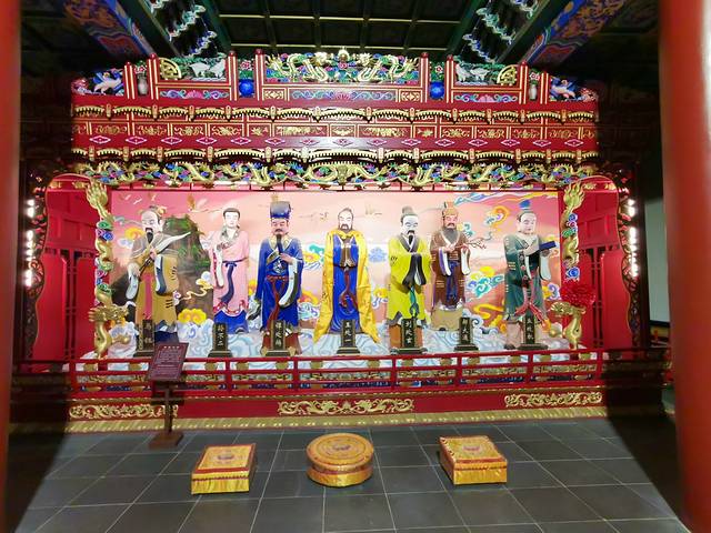 和气大殿殿内供奉有孔子,老子,释迦牟尼,体现三教合一、一团和气。三教合一是指佛教、道教、儒教三个教派的融和。孔子代表的儒家彰显的是人与社会的和谐,老子代表的道家彰显的是人与自然的和谐,释迦牟尼代表的佛家彰显的是人与自我的和谐。