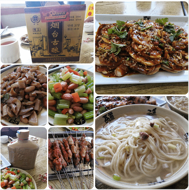 游玩蓬莱阁二个小时,步行回酒店退房。沿烟汕线-蓬栖高速-恒山路到达牟氏庄园,行驶了一个小时70公里,路上车非常少。到了午餐时间,在网上搜了搜,热评的一家小店,就在牟氏庄园的不远处。门口路边有停车位。特色面,是摔面,浇上骨汤,清淡劲道。他家的烤肉非常好吃,在门口用炭火现烤,肉食也很新鲜,价格也不贵。配上几样小菜,吃的饱饱的。。。