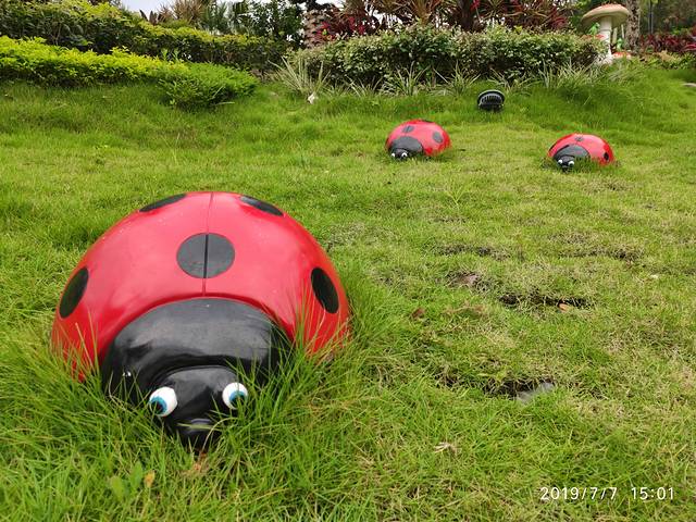 草地上的七星瓢虫,红色的外壳在绿草地上显得十分突出。