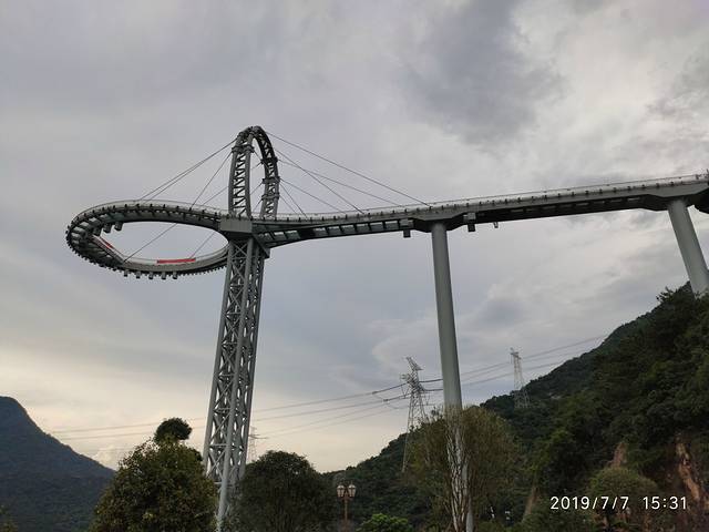 天门悬廊是一个集声、光、玻璃、水瀑于一体的超级玻璃桥廊项目,修建于险峻的漂流河道之上,由三个钢混结构的巨型立柱支撑,外观如同双球拍交叉立于高山之上,直指云天,因此被昵称为“大球拍”。