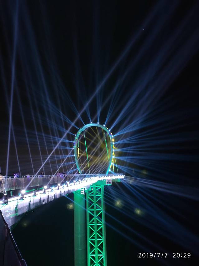 灯光秀开始之前,一直在下雨,玻璃悬廊上到处都是水迹,工作人员不得不全场出动去清理水迹。灯光秀开始后,雨势稍弱但并没有停下来的意思,观看时都要打着雨伞,好在随着高潮的来临,雨才慢慢停下来。此时的玻璃表面还残留着水迹,表面非常湿滑,每走一步都要战战兢兢。旁边一个胖子就因此摔跤了,发出的响声吓大伙一跳,还好玻璃够结实,不然今天就交代在这里了。