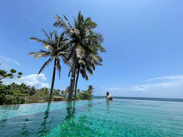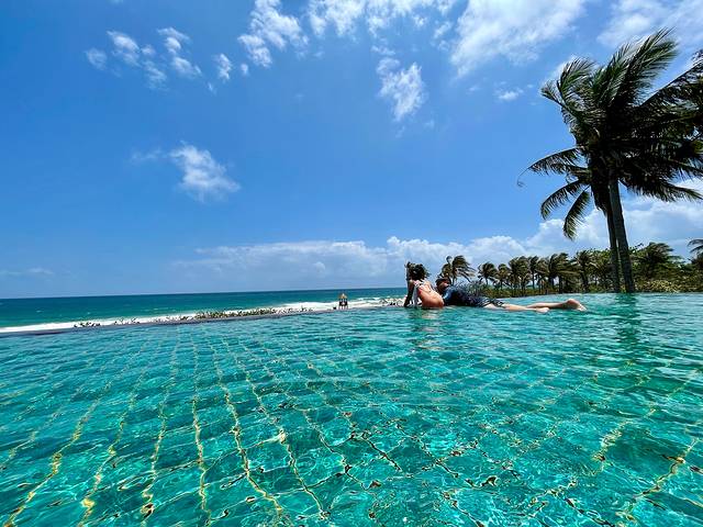 吃过早餐回房间泳池陪孩子游泳,游了不过瘾又去了大堂前面的无边泳池,最美的风景就是这无边泳池了。