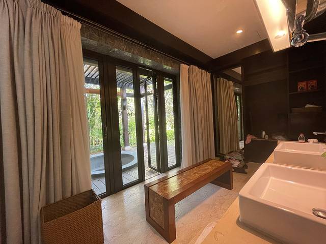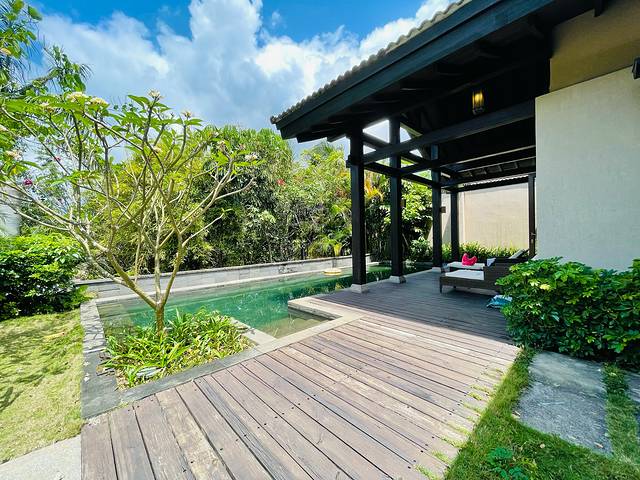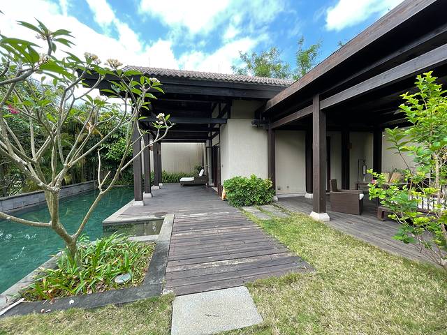 房间是独栋的小别墅型的,一进门就是泳池,房间后面是个泡池,侧面还有个小庭院,可以休息。房间还挺不错。就是游泳池里飘了许多蚊虫和树叶😂这间小别墅应该好几天没有客人入住了吧。