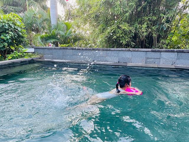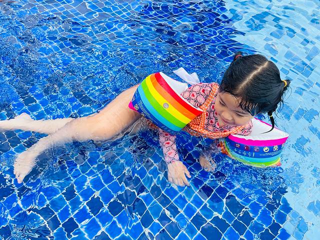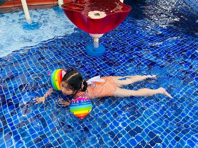 在泳池玩好了回房间休息啦……起床了继续在院子里的泳池陪孩子玩,这次出来她已经可以用浮板自己游啦……当然安全第一还得大人在身旁看着的。