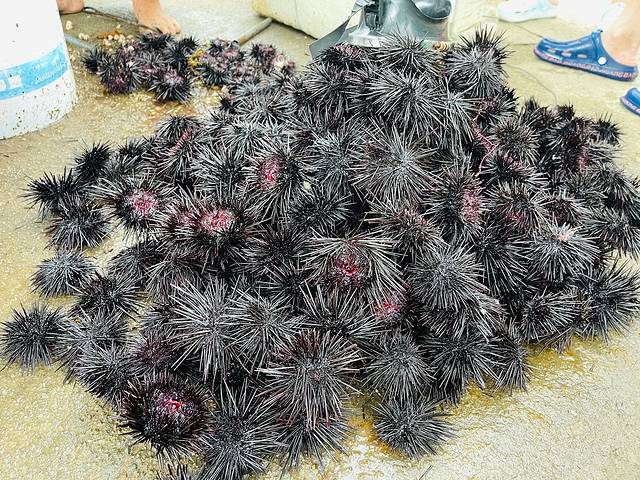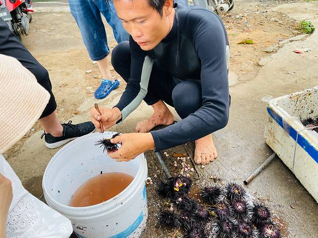 刚从停车场🅿️那边下来就看到有在路口挑海胆的,我还去尝了一下新招的海胆,除了海水的咸味其他味道还真尝不出来😅