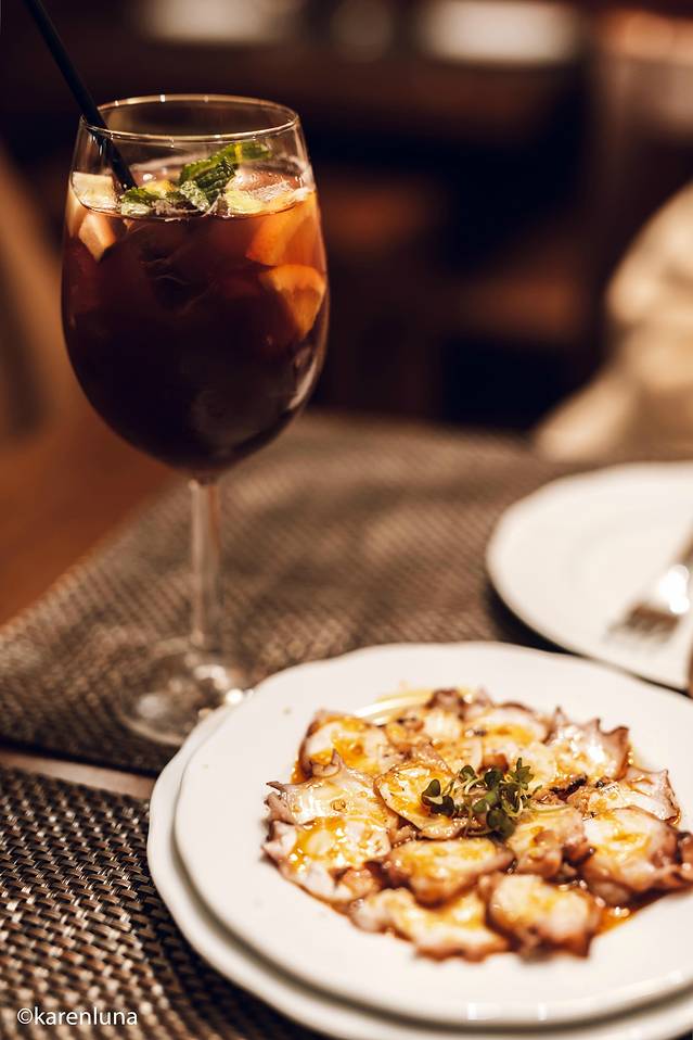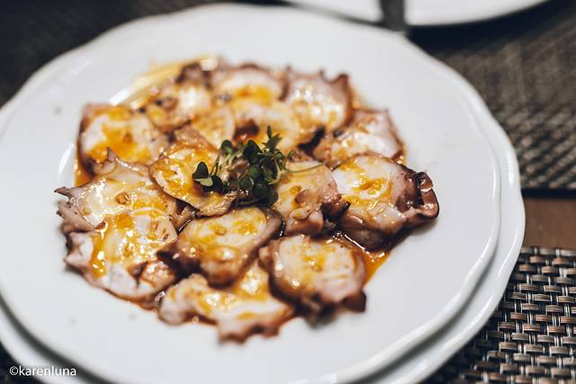 香煎章鱼腿真的是完整的章鱼腿摆在盘子里。第一次见到这么粗壮这么完整的好几条,总觉得口感上会不会咬不动,但当放入口中的时候,还是很Q弹的。