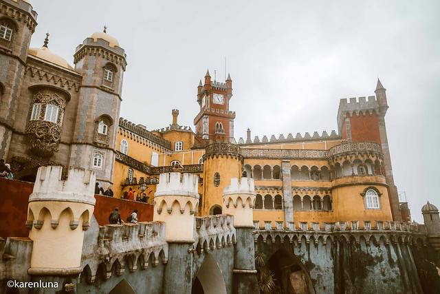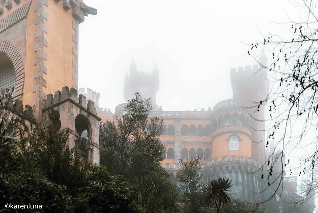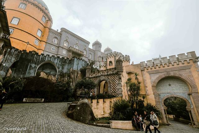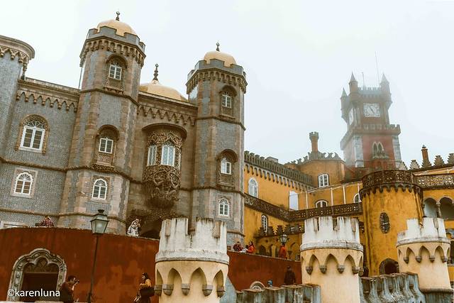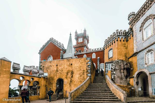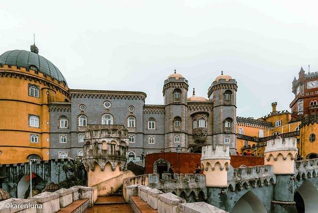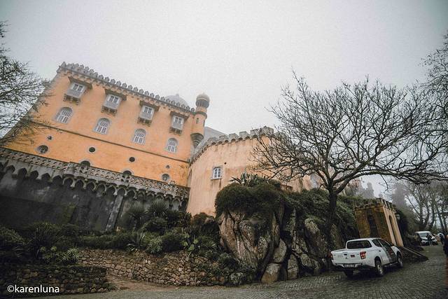 出发前就一直期盼着欣赏到蓝天白云下那黄色与红色的明艳的色彩碰撞,就连今天早上出门看到阴雨绵绵的天气时也还是抱着侥幸心理,所以即使肠胃难受至极也还是强忍出门。但当沿着山间小路走到宫殿脚下看到被云雾遮着看不太清楚的佩纳宫时,心情真是碎成了渣渣。整个城堡没有了明艳的色调,有的只是阴沉破旧的沧桑感。朋友看到了我拍的照片,评价说是像极了一座被废弃的主题乐园…