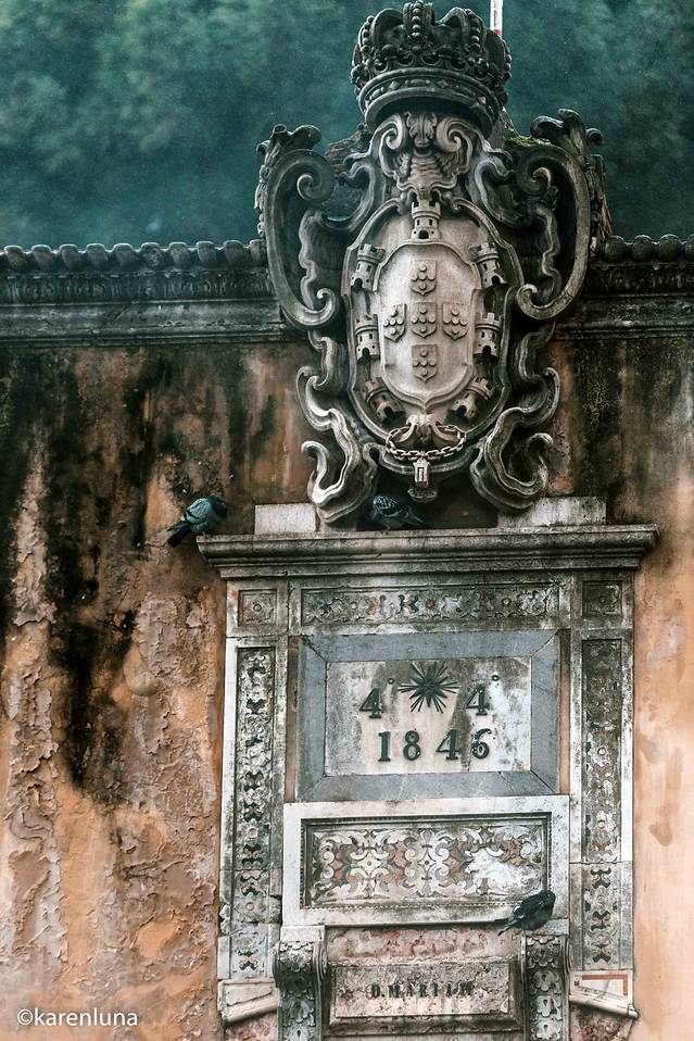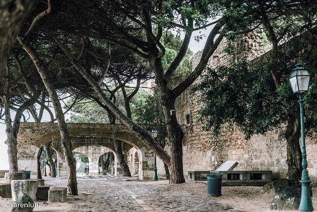 从偶遇零星几个当地居民,到渐渐看到稀稀拉拉不少行人,再到最后不宽敞的街道满是来来往往的游客。一路拾级而上的我俩在一个转弯处忽然看到了一处很像旧时城堡的大门,大门中央不仅有着精美的巨型徽章,那1846几个数字也赫然雕刻在那儿,而这正是我们要前往的圣若热城堡的大门。