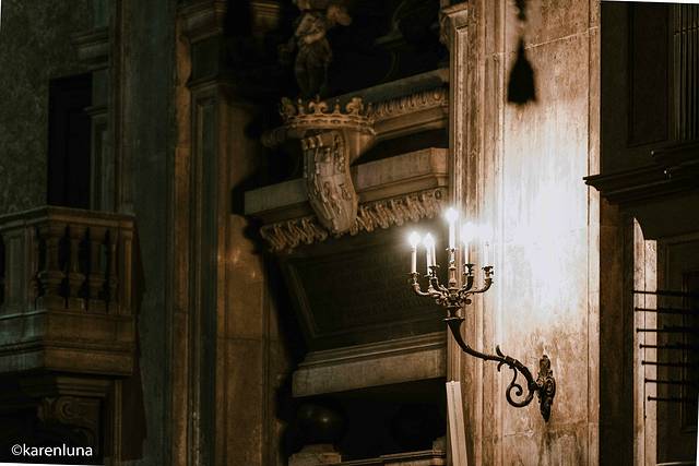 这么多年,去过的 欧洲 教堂早已数不胜数,但是可以在晚上这么细细品味的还是第一次。绕着主教堂的回廊里漫步,看着 石柱 上微弱的烛光映射在壁画上,并没有感觉到阴森恐怖,反而让我感觉一丝温暖。那一个个精雕细琢的神像、一幅幅栩栩如生的油画,都不禁让人驻足,品味那其中的文艺韵味。