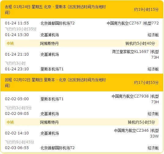 回程: 里斯本 (LIS)—— 阿姆斯特丹 (AMS) 航班:CZ7938 时间:05:00—09:05(3h)