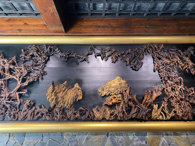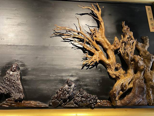 我们来的时候恰巧景区是免门票的,幸运极了,我猜想可能是因为疫情的关系,也可能是过年的福利延至今日还未结束。景区北大门是用奇石雕刻而成,镂空的设计,别致的墙面,使整个大门看起来更加的有气势。回廊俩边的墙壁上展示着一幅幅的根雕作品,木质的凳子上有游客在这闲坐,但他们更像是在探讨着根雕的奇妙。