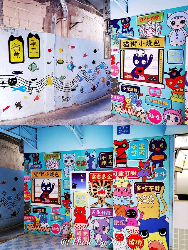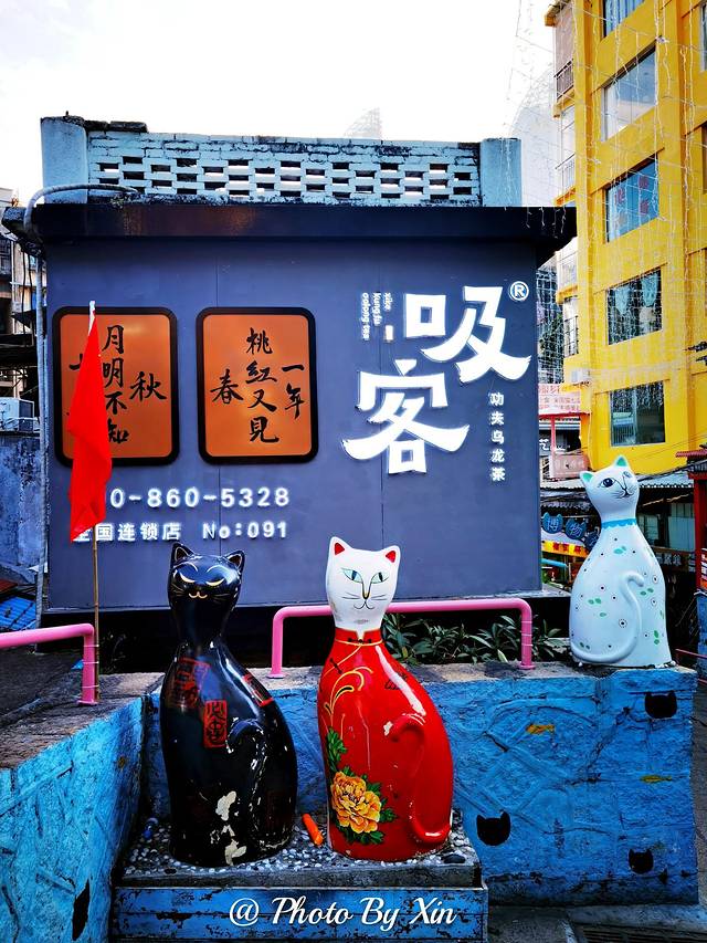 这里到处都是可爱的猫咪元素,街边的彩绘猫咪雕塑、墙上风格迥异的猫咪涂鸦、地上可爱的猫咪头像、就连电线杆上都是猫咪的色彩画,超级适合拍照。一定要选在一个天气晴好的时候来打卡。