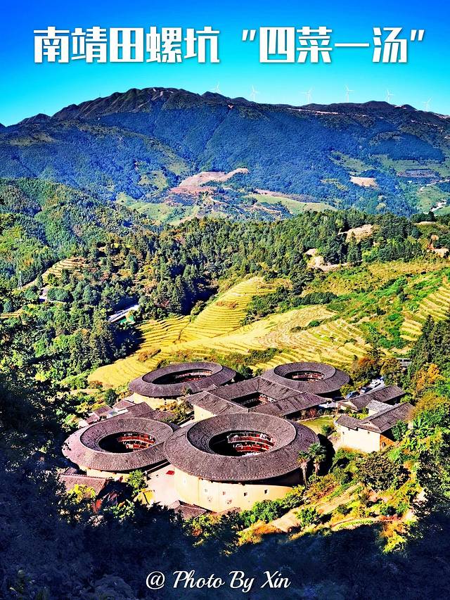 田螺坑畔土楼家,雾散云开映彩霞,俯视宛如一朵花,旁看神似布达拉。由❶座方形+❸座圆形+❶座椭圆形,共❺座土楼组成的田螺坑土楼群。居中方形步云楼和右上圆形和昌楼,始建于清嘉庆元年(1796年),周边相继建起振昌楼/瑞云楼/文昌楼,五座土楼依山势错落布局,群山环抱,居高俯瞰,像朵盛开的梅花点缀大地,又像是飞碟从天而降,屹立在大地上,构成人文造艺与自然巧妙天成的绝景。