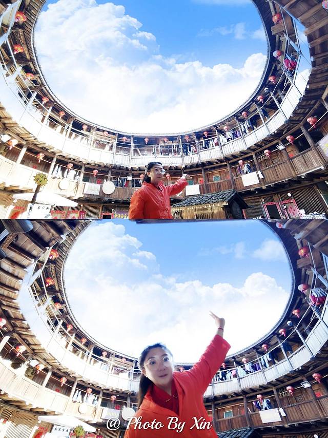 我们的目的地:福建土楼王景区【高北土楼群】。包括承启楼、侨福楼、世泽楼、五云楼,其中规模最大的圆楼号称土楼王承启楼,建于明崇祯年间,清康熙四十八年建成。高四层,楼四圈,上上下下四百间;圆中圆,圈套圈,历经沧桑三百年。这座巨大的土楼,是江姓家族之城。因夯筑外环土墙,天公作美,均为晴天,直到下墙枋出水,天才下雨,老天相助,所以承启楼的祖辈又称其为【天助楼】。以高大、厚重、粗犷、雄伟的建筑风格,以及庭园院落端庄丽脱的造型艺术设计,让我们这些慕名而来的参观者叹为观止!