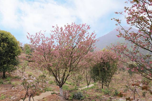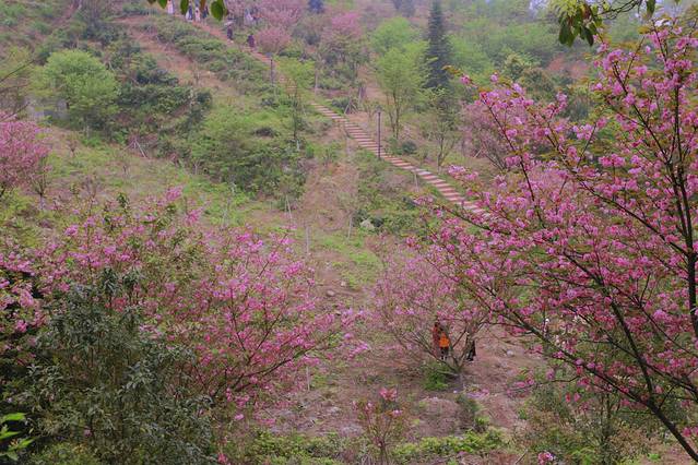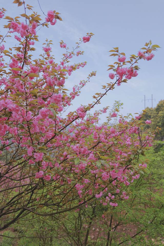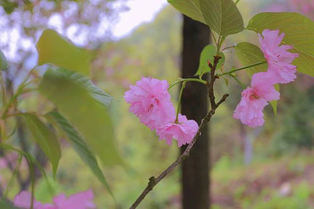 正值阳春4月,刚好是嵩云山的樱花季,走在山涧,放眼望去,一片片的晚樱开的甚是漂亮,走进还能看到勤劳的小蜜蜂正在嗡嗡的劳动着,空气中也弥漫着淡淡的香气。