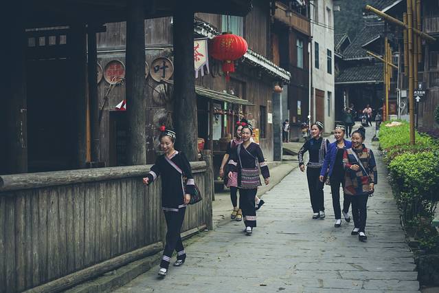 走在侗族的寨子里,颇有一番陶渊明笔下“阡陌交通,鸡犬相闻。其中往来种作,男女衣着,悉如外人。黄发垂髫,并怡然自乐”之感。身着传统民族服饰的村民,一点也没有因为游客的到访闲得拘谨,反倒是很热情的向我们展示着他们的特有文化。