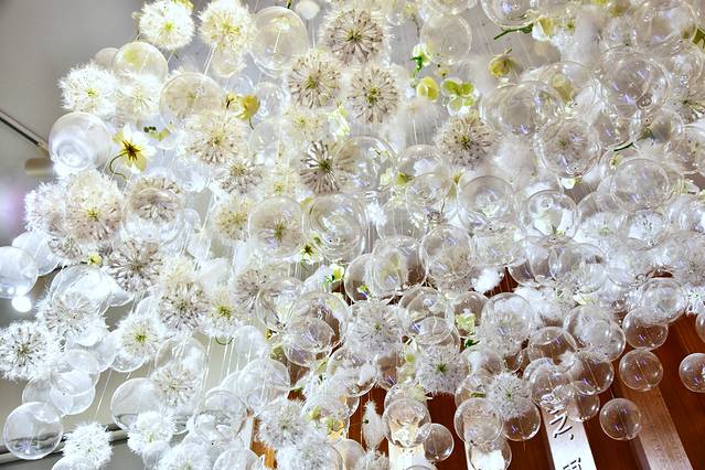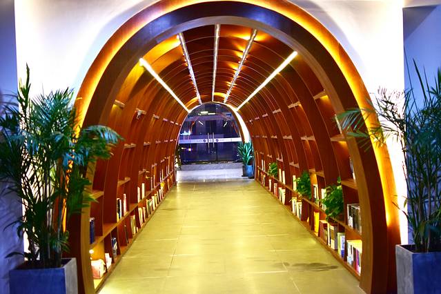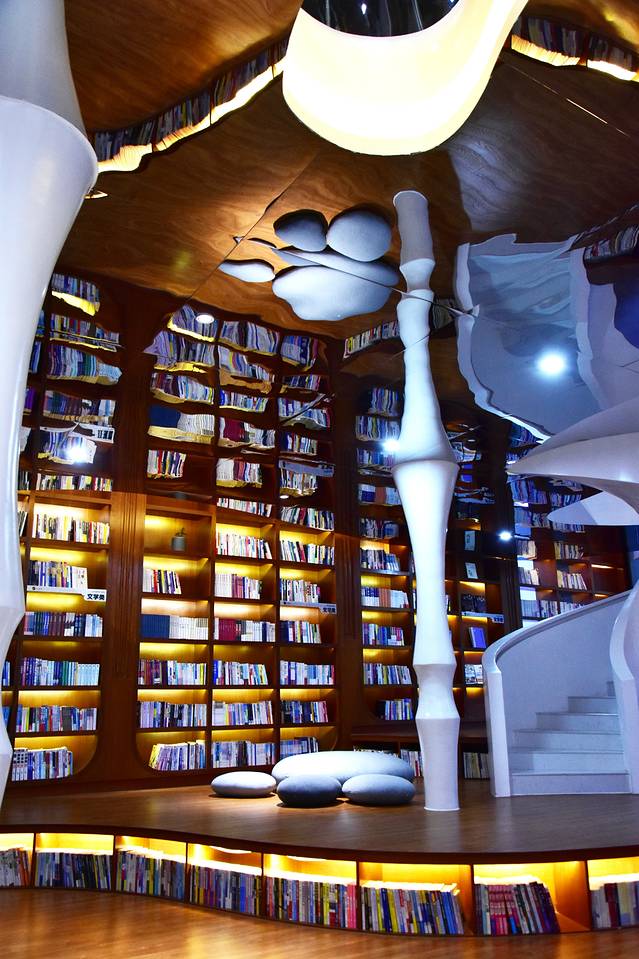 在一楼大厅就被吸引住了,一大片蒲公英泡泡吊灯真的好唯美,顺着楼梯走上二楼的书吧,哇,天花板就是一面镜子,把书架的高度又映射多了一层,显得空间更加开阔,白色的旋转楼梯,前卫又时尚,把书吧点缀成一个艺术空间。结结实实的实木书架,厚重又沉稳,整面书墙非常壮观。整个书吧收藏了有3.5万册图书,并配备了先进的书籍云端管理系统