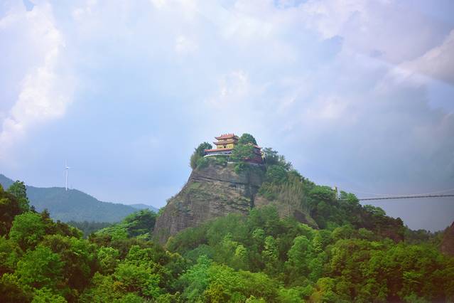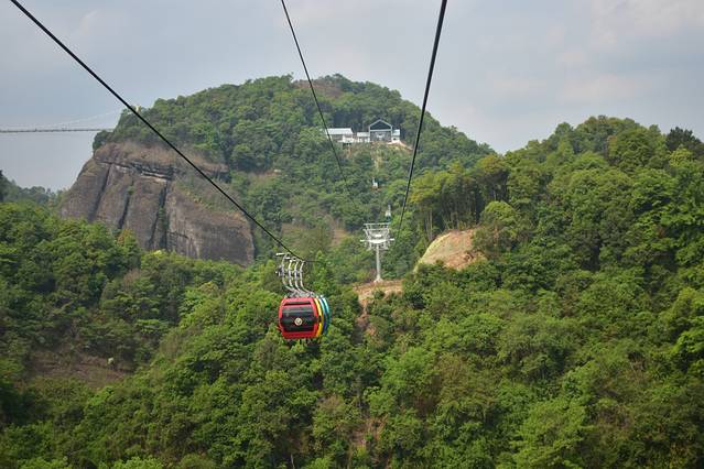 缆车运行的速度不用那么快,因为我们可以在缓缓上升的过程中,通过玻璃窗户,欣赏天龙山的险峻和雄伟,远远就可以看到最高的的山尖尖上有一组寺院建筑,那就是天龙寺。