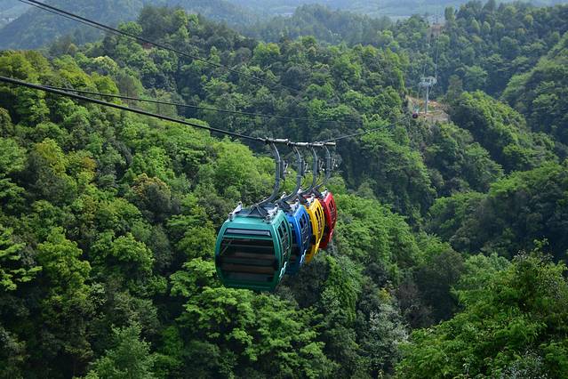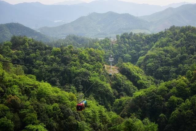 坐在飞龙索道的轿厢里可以欣赏山中美景